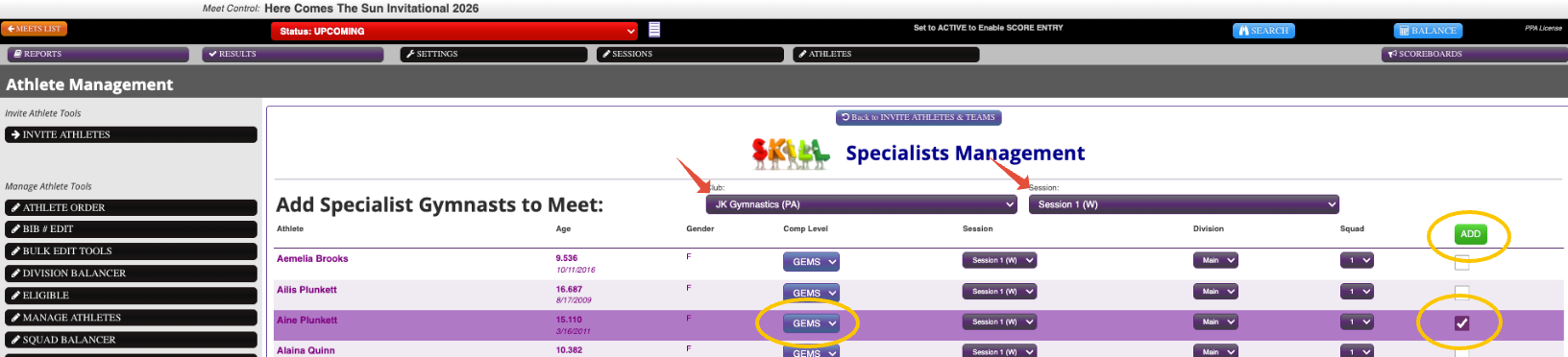 - Find your athlete on the list - select what level they will compete as a specialist - then click the checkbox - select ADD