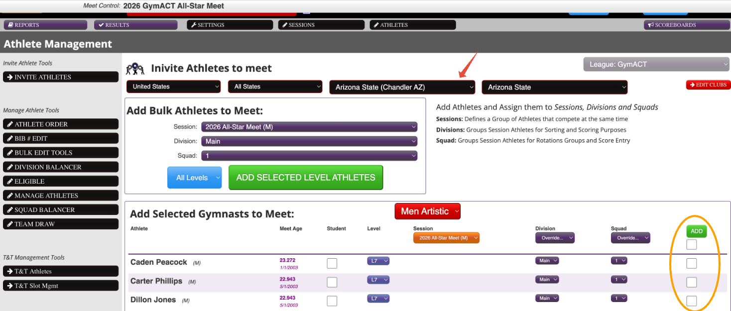 - Check the box to the right of the athlete then click ADD when you have selected all of them.