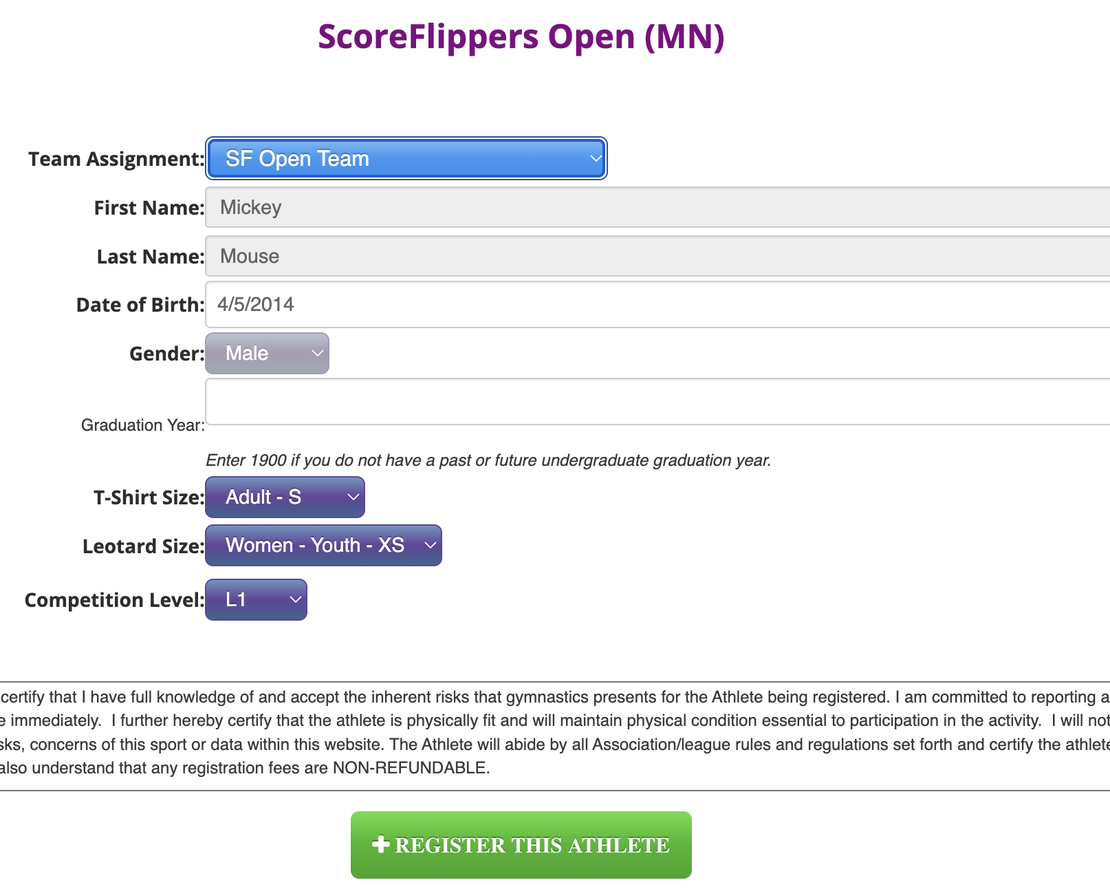 Step 5: (If athlete NOT found) Fill out the correct information and click REGISTER THIS ATHLETE.