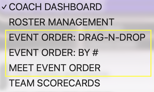 Step 3: There are three ways to set your order. EVENT ORDER: DRAG-N-DROP, EVENT ORDER: BY # AND MEET EVENT ORDER. If you do not have very much variation in your VARSITY line up, our suggestion is to use EVENT ORDER: BY #. Otherwise our suggestion is to set your line up in MEET EVENT ORDER per meet you are invited to. This way you can set your Varsity line up and JV separately.