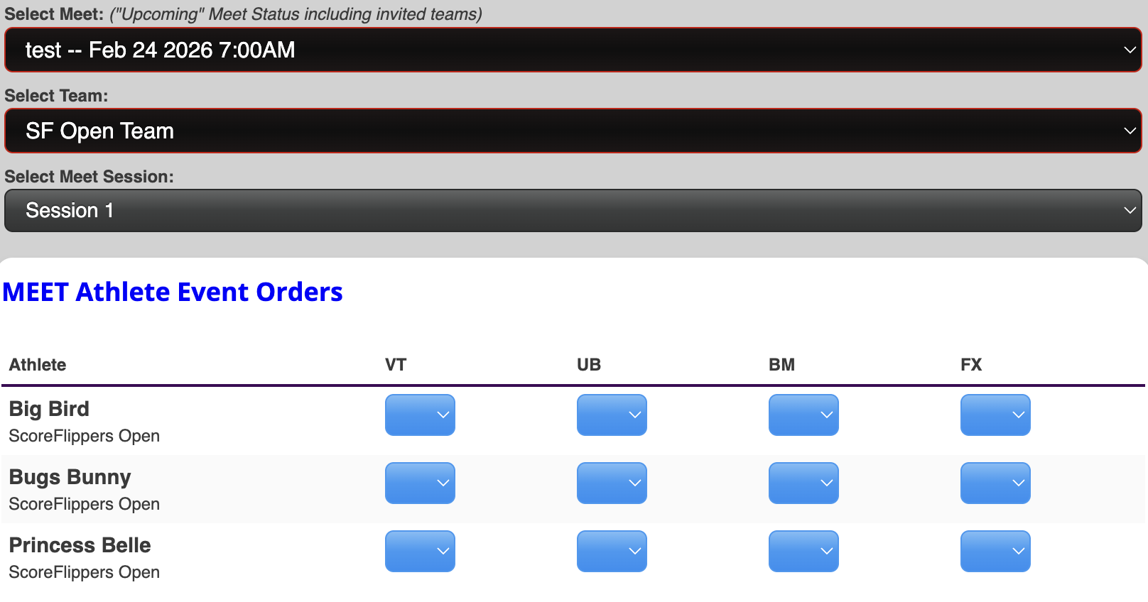 From this screen you can select your order per event. You can update future line-ups, reset and randomize the line up from here as well. Select the drop down to set what order you would like your athletes to compete it.