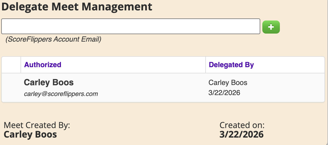 Step 9: If you have a parent or non-coach helping with scores, you can delegate them as a Meet Manager. (Make sure they have a ScoreFlippers account, and then add their email to the field).