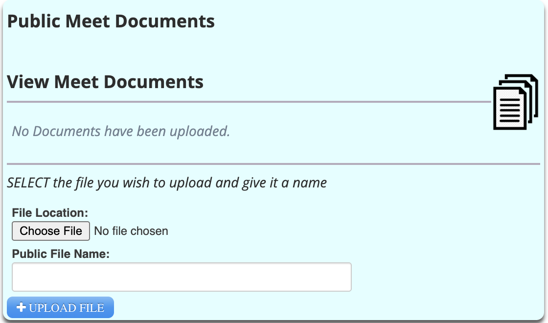 Step 12: If you have a meet flier or information you want the other teams or parents to have access to; you can upload them in the box Public Meet Documents.
