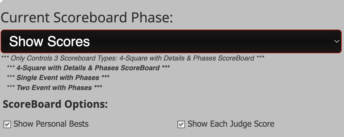 Step 4: Check the settings on the bottom of the "Current Scoreboard Phase". You can choose if you want to "Show Personal Bests" which will entail fireworks showing up when the score is displayed for that athlete. You can also "Show Each Judge Score". By unchecking the box this will undo or take off both of those and will only show the athlete name, team name and the score.