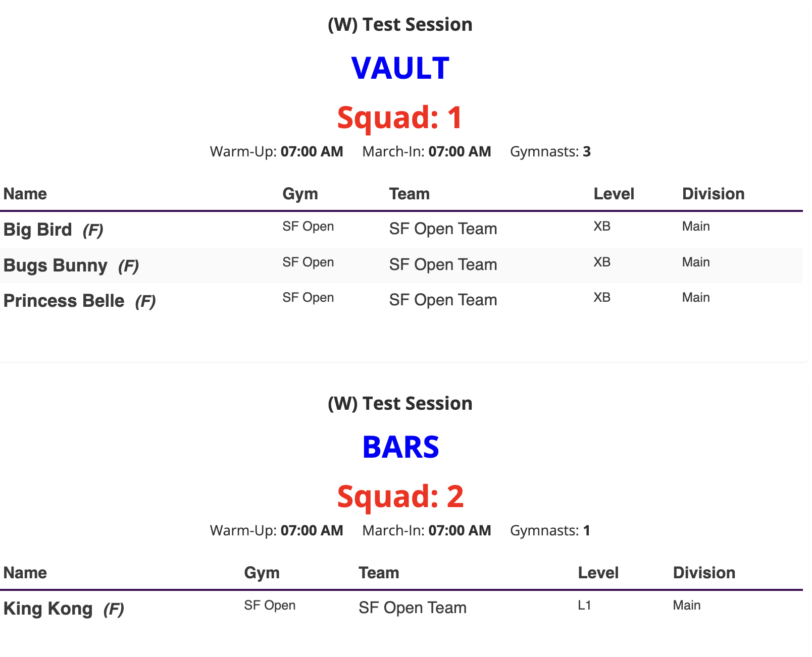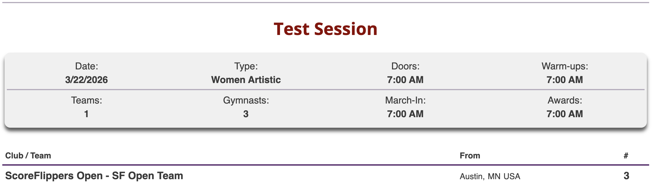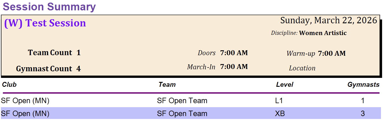 Session Summary - This report will tell you how many Teams and Gymnasts are in the meet and then break it down by how many gymnasts of each team and level are in the meet.